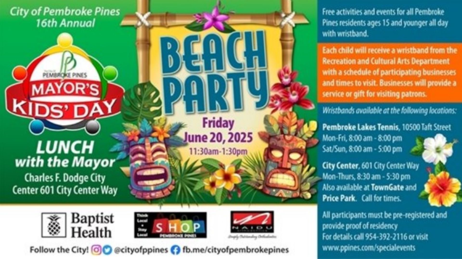 Pembroke Pines, Florida – On Friday, June 20, 2025, Pembroke Pines will be buzzing with excitement as the 16th Annual Mayor’s Kids Day “Beach Party” kicks off from 11:30 AM to 1:30 PM at the Charles F. Dodge City Center, located at 601 City Center Way. This annual event, hosted by Mayor Angelo Castillo, promises an afternoon of fun, entertainment, and surprises for the city’s youngest residents. Children aged 15 and under are invited to join in the festivities, with a variety of exciting activities lined up to make the day unforgettable.