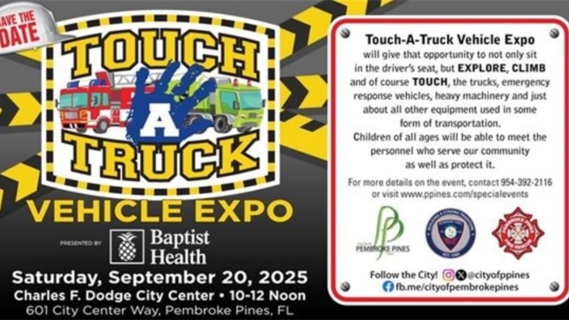 Pembroke Pines, Florida – The City of Pembroke Pines is gearing up for an exciting and educational event this fall – the Touch-A-Truck Vehicle Expo. Presented by Baptist Health, this hands-on event invites attendees of all ages to explore an impressive array of trucks, heavy machinery, emergency response vehicles, and other equipment used in transportation. Set to take place on Saturday, September 20, 2025, from 10 a.m. to noon at the Charles F. Dodge City Center, the expo promises a fun and interactive experience for everyone.