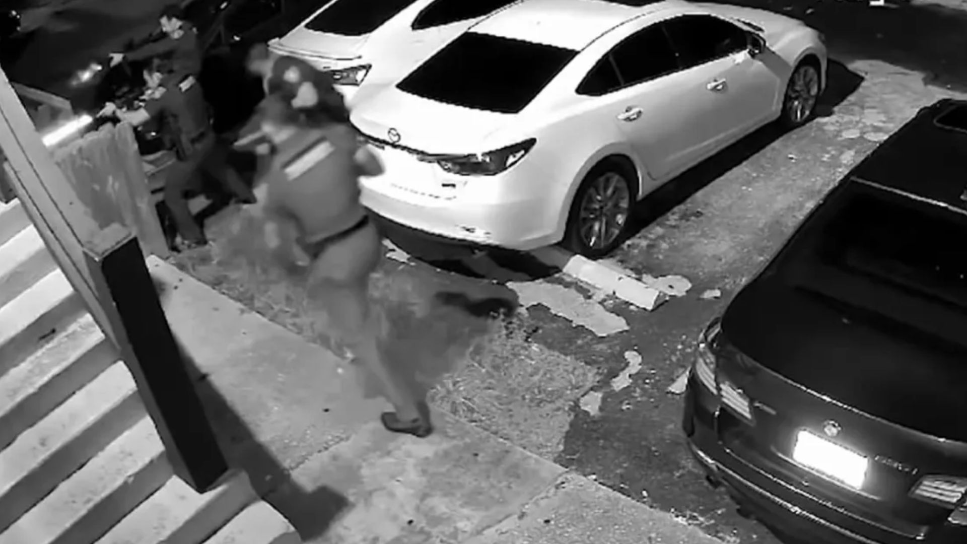 Surveillance footage captured a light-colored vehicle approaching the residence. The vehicle briefly drove past the home before reversing back into view. Two individuals armed with firearms then exited the car and discharged more than a dozen rounds into the property. After the attack, the suspects fled the scene, leaving investigators searching for leads.