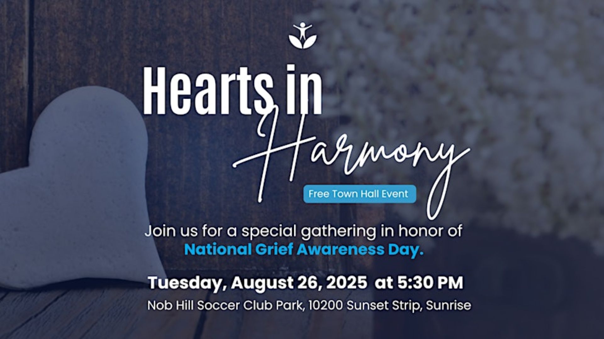 Sunrise, Florida – The City of Sunrise will soon host an evening dedicated to healing, connection, and conversation as residents come together for the Hearts in Harmony Town Hall. The free community event is scheduled for Tuesday, August 26, 2025, beginning at 5:30 p.m. at Nob Hill Soccer Club Park, located at 10200 Sunset Strip in Sunrise. Organized in recognition of National Grief Awareness Day, the program will feature local experts, mindfulness practices, and an open forum for discussion.