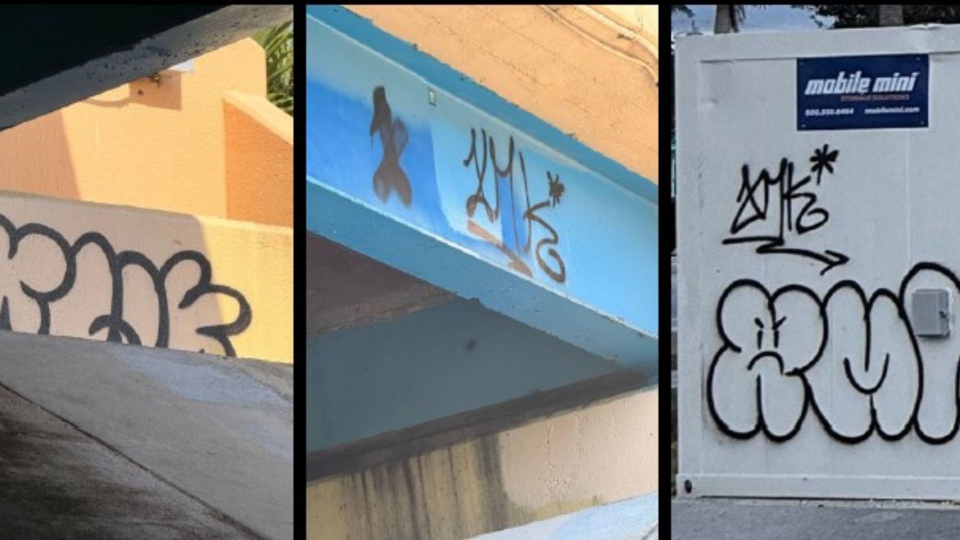 The first incident was noticed on Friday, Aug. 8, when deputies in the Deerfield Beach district observed freshly painted graffiti on the portable office building of the Community Redevelopment Agency (CRA) located at 1601 E. Hillsboro Blvd. Less than three weeks later, on Tuesday, Aug. 26, employees from Deerfield Beach Parks and Recreation discovered similar graffiti on the Sullivan Park Drawbridge at 1741 Riverview Rd.