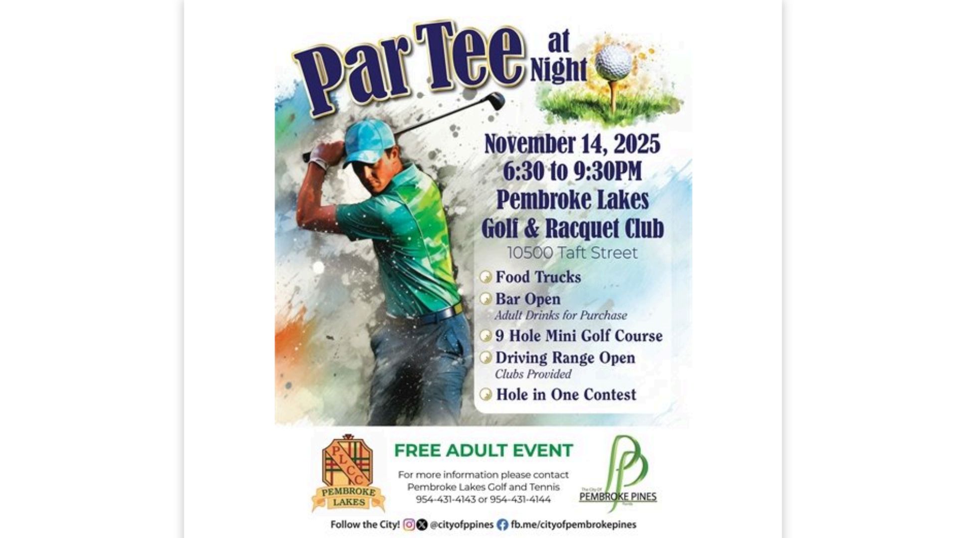 Pembroke Pines, Florida – Adults in Pembroke Pines are in for a night of golf, music, and fun as the City of Pembroke Pines announces Par-Tee at Night, a free event set for Friday, November 14, 2025, from 6:30 p.m. to 9:30 p.m. at the Pembroke Lakes Golf & Racquet Club, located at 10500 Taft Street. Designed exclusively for adults, this evening promises an exciting mix of golfing activities, entertainment, and social engagement.