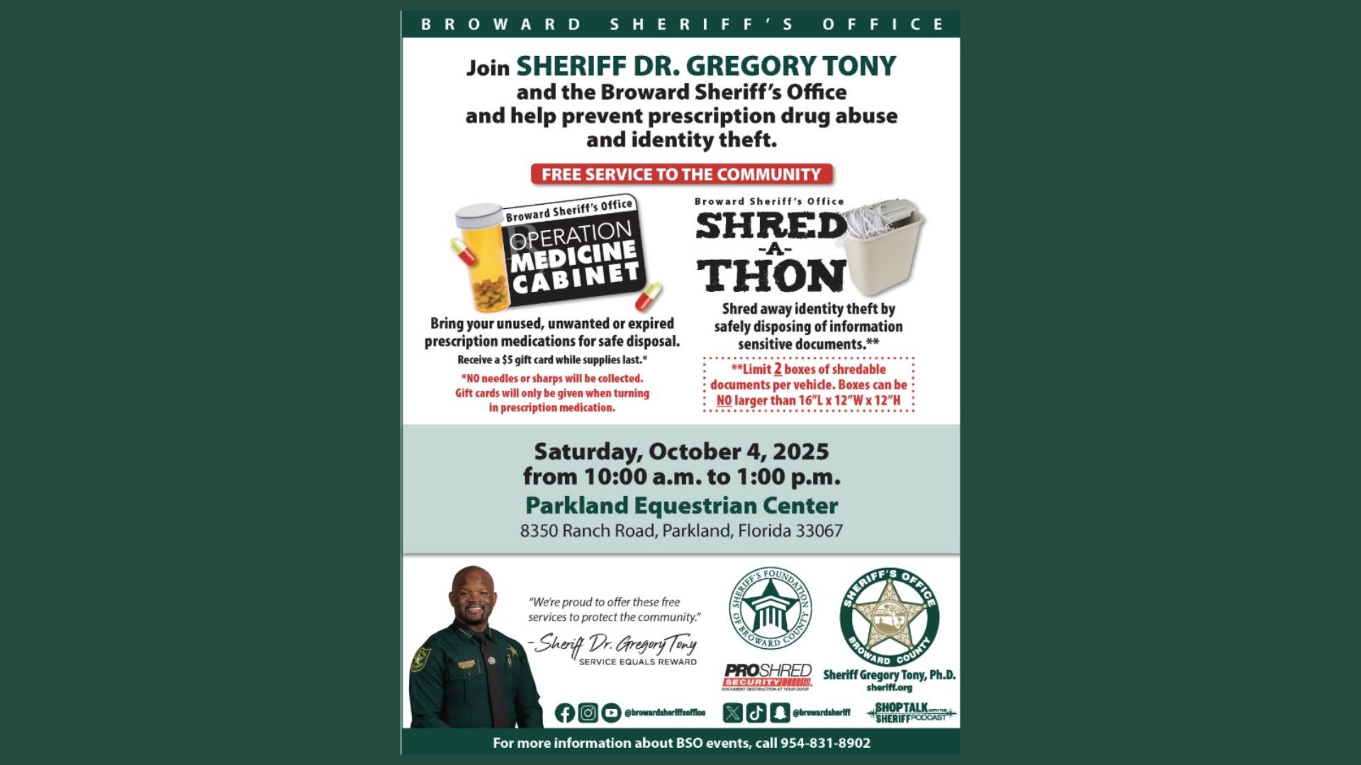 Parkland, Florida – Parkland residents have a chance to declutter their homes and safely dispose of sensitive materials this weekend as the Broward Sheriff’s Office hosts its Operation Medicine Cabinet and Shred-A-Thon event. The free community event will take place on Saturday, October 4, from 10 a.m. to 1 p.m. at the Parkland Equestrian Center, located at 8350 Ranch Road.