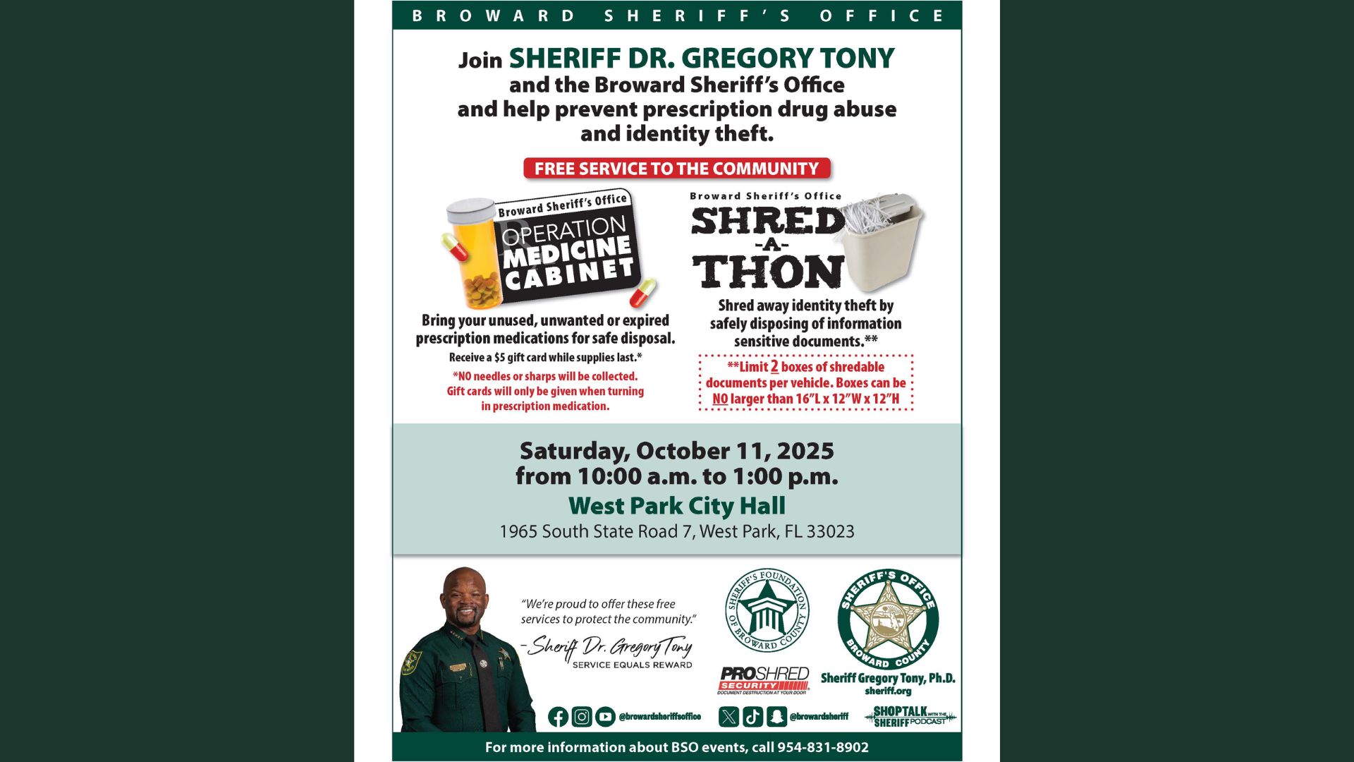 For more information about the Operation Medicine Cabinet and Shred-A-Thon event, residents can call 954-831-8902 or visit the BSO website at www.sheriff.org. This event offers a practical and secure way for the West Park community to take care of personal documents and medications in one convenient location.