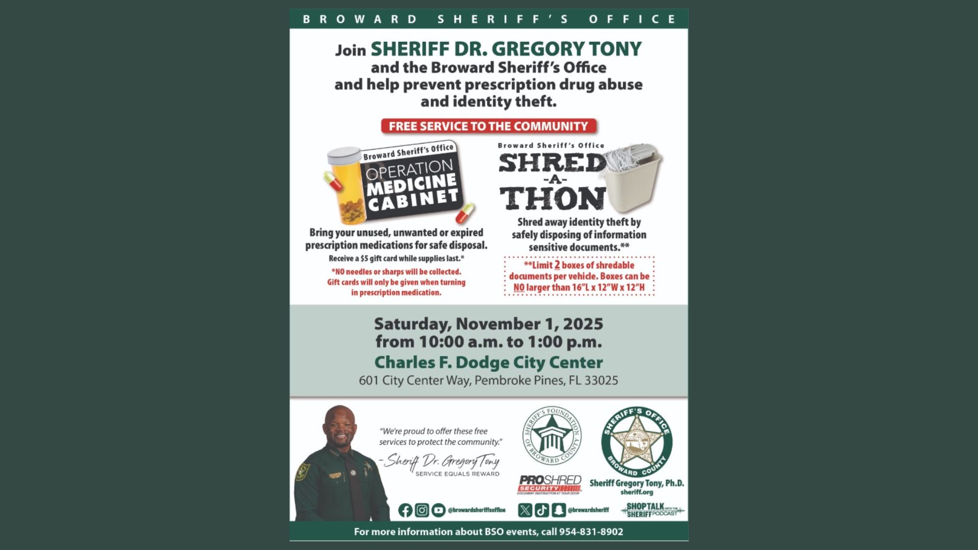 Pembroke Pines, Florida – The Broward Sheriff’s Office (BSO) is once again helping residents protect their personal information and the environment with its upcoming Operation Medicine Cabinet and Shred-A-Thon event. The free, community-focused initiative will take place on Saturday, November 1, from 10 a.m. to 1 p.m. at the Charles F. Dodge City Center, located at 601 City Center Way in Pembroke Pines.