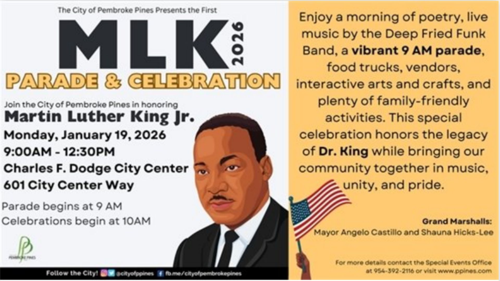 With a combination of parade excitement, live performances, family activities, and opportunities to support local businesses, the MLK Jr. Day Parade and Celebration in Pembroke Pines promises to be a memorable and uplifting event. Residents are encouraged to gather, reflect, and celebrate the enduring impact of Dr. King while enjoying a day of community, culture, and connection.