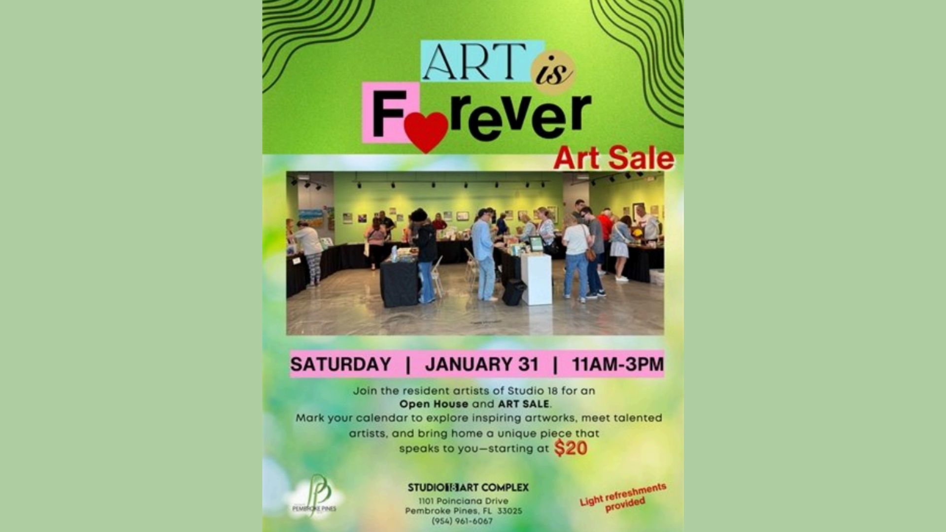 Pembroke Pines, Florida – Art lovers and community members alike are invited to explore creativity and connect with local artists at Studio 18 Art Complex this Saturday, January 31, 2026. From 11 a.m. to 3 p.m., the studio will open its doors for the Art is Forever Open House and Art Sale, offering visitors a chance to discover original works and meet the artists behind them.