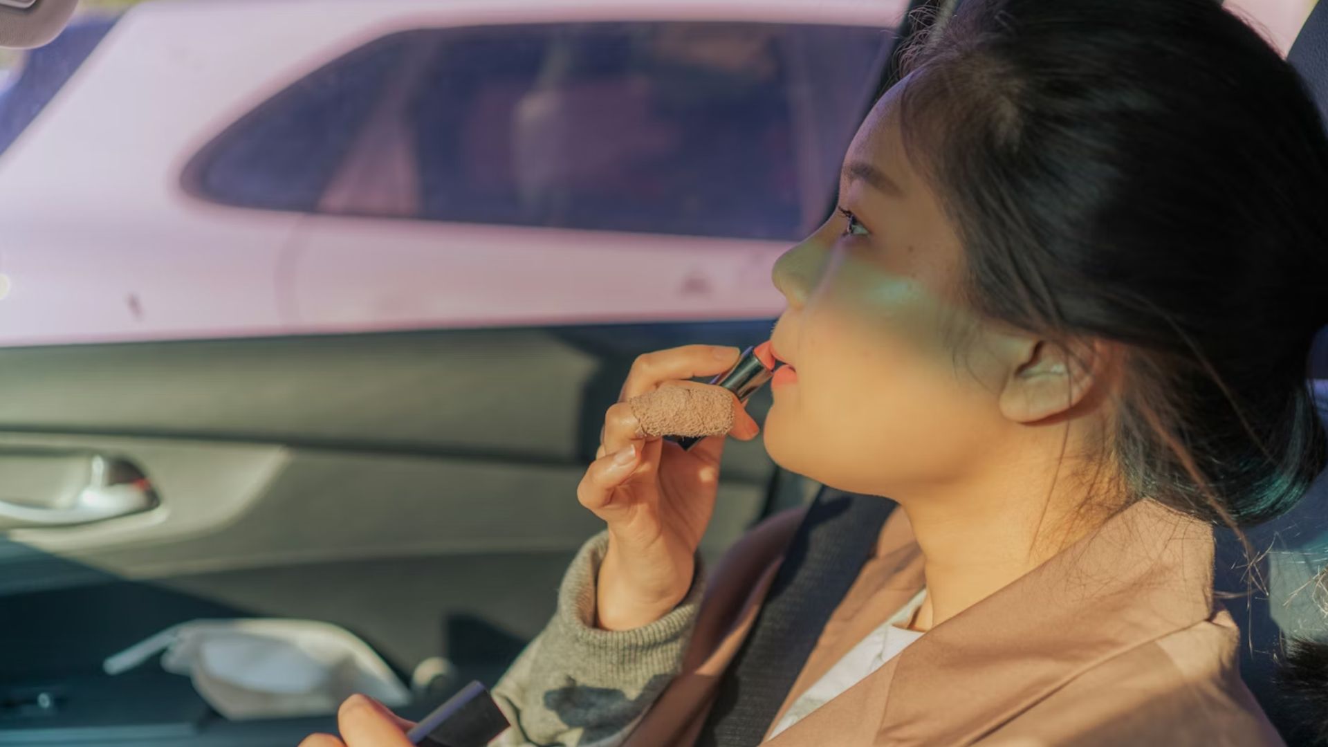 Inside the car, the driver had flipped down her sun visor, using its mirror and built-in light as she carefully applied makeup. What made the situation more alarming was that the vehicle was not stopped—it was moving through traffic.