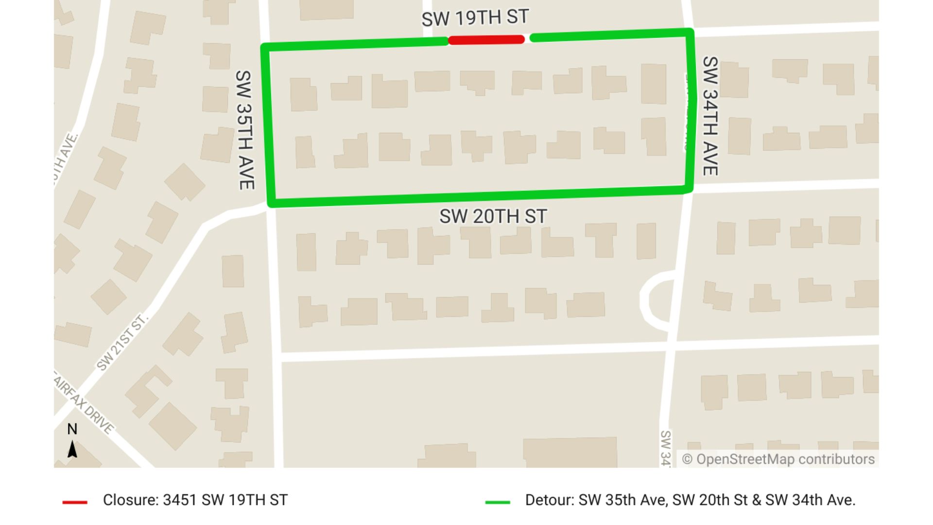 A detour will be set up to help guide drivers around the closure. Vehicles will be redirected via SW 35th Avenue, SW 20th Street, and SW 34th Avenue. Clear signage will be posted along the route to assist motorists in navigating the temporary changes safely and efficiently.